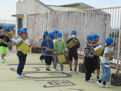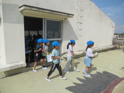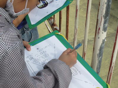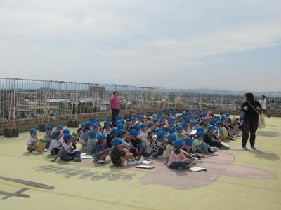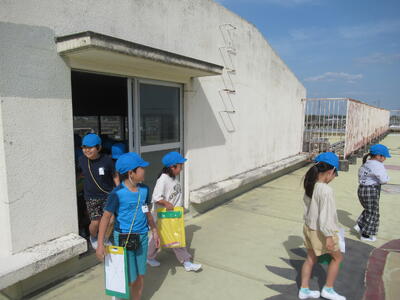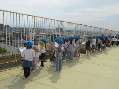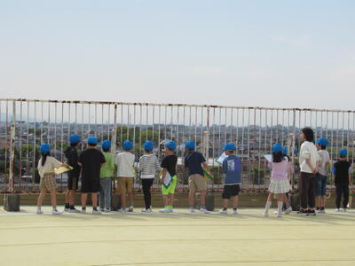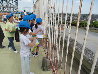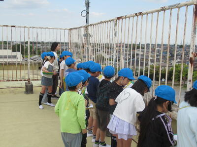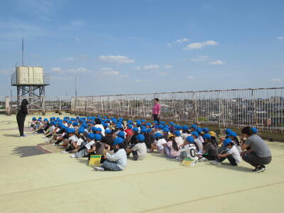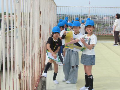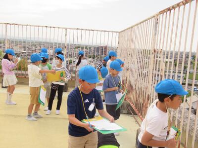 本日第6校時、3年生が社会科の方位の学習で、屋上からの景色を見学しました。屋上に足を踏み入れると、子どもたちは、「お~すげえ~!」「見える見える!」「やったぁ~!」「わ~!」「ぎゃ~~!」と、それはそれは大騒ぎでした!その後は、落ち着いて周りの景色をじっくり眺め、東西南北の方角に、何があるのか記録用紙に記入していました。途中で「校長先生の家は見えますか?」と子どもたちが聞いてきたので、「春日部だからどうかな?」と答え、東の方角を指さすと、「どこどこ?見える?」「何色の家?」「屋根の色は?」と、みんな必死に探していました。本当にかわいいですね。学校から30㎞以上も離れているので見えるわけがないのですが・・・。それでも、「見えるかもよ!」「探そうぜ!」と、みんな夢中でした。しばらくみんなでわいわいがやがや言いながら探していると、ある男子が、「春日部じゃ、ここから見えるわけないかっ!」とバッサリ言い放ち、みんな現実に戻りました😅