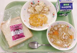 献立【食パン チョコクリーム 牛乳 チキンこんがり焼き ジャーマンポテト コンソメスープ】