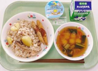 献立【秋の香りごはん🍠 牛乳 こいわしフライ お月見汁 お月見デザート🌕】
