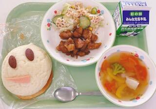献立【こうのすひなちゃんパン 牛乳 豚肉と鴻巣梨のきらめきソース コスモスサラダ🌸 彩り野菜スープ】