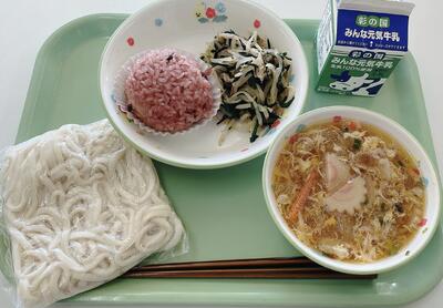 献立【わかめ菜めし 牛乳 いかのかりん揚げ かきたま汁 みかん🍊】