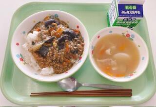 献立【マーボーなす丼🍆 牛乳 トックスープ】