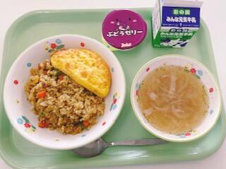 献立【カレーピラフ 牛乳 オムレツ オニオンスープ ぶどうゼリー🍇】