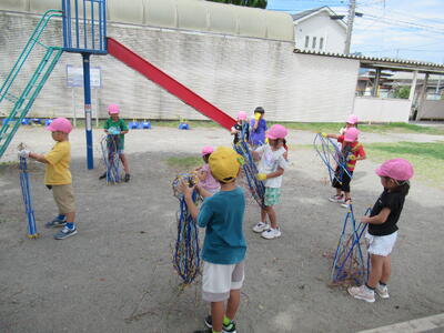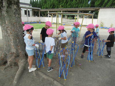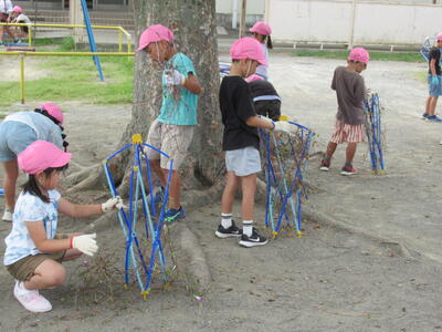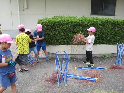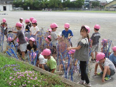 本日3時間目に、1年生3クラスが校庭で朝顔のつるを支柱から外していました。聞くと、朝顔のつるでリースを作るのだそうです。しかし、支柱にからみついたつるはなかなか取れないようで、みんな悪戦苦闘していました。私が行くと、「校長先生~とってくださ~い!」、「校長先生お願いとってぇ~」と、甘えた声でお願いしてくるので、「うん、いいよ~校長先生がやってあげるぅ~」と、言いたかったのですが、そこは心を鬼にして、「もう少し自分でやってごらん」、「(早く終わった子に)○○さん、手伝ってあげてね」と、なるべく自分たちでやらせるようにしました。そして、あまりにも支柱にからみついてこれは厳しいな、と思う子については、手伝ってあげました。すると、周りで見ていた子たちが「校長先生すご~い!」、「はやっ!さすが!」と、ほめてくれました。また、中には、「お礼に校長先生にもリース作ってあげるね!」と、うれしいことを言ってくれる子もいました。1年生の子たちは、みんな愛のある子に育っていますよ!