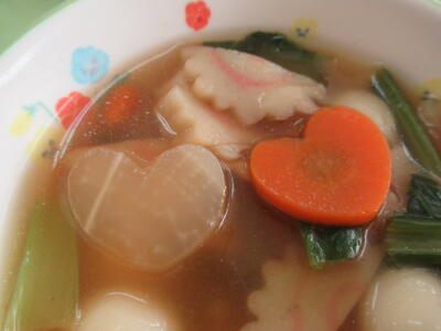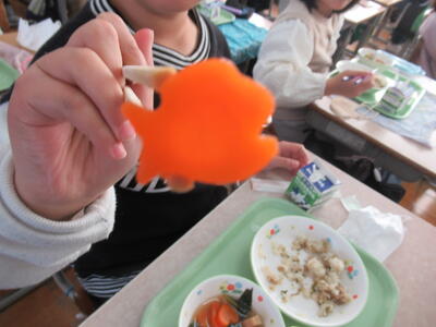 本日は、3学期はじめての給食でした!そして、今日の献立の注目は「おみくじ雑煮」です!栄養教諭に聞くと、ハートの形❤️、星の形⭐、魚の形🐟をした大根と人参が入っているとのことでした。そのことが放送で流れると、子どもたちはみんな必死になって雑煮の中を探し、「ハートがあった!」「ぼくのは星だ!」など、もう大人気でした!ただ、ハートや星の形は多くありましたが、魚の形はなかなかレアなようで、私も各教室を回ったのですが、魚の形をした大根や人参が入っていた人は、ほんのわずかでした。本校の給食は、味はもちろんピカイチ✨ですが、それでけではなく、子どもたちが食に対する興味や関心が持ち、楽しみながら食べることができるよう、日々栄養教諭や調理員さんたちが工夫をしています。いつも本当に感謝です!🙇♀️ちなみに、私はハートの形の大根と人参が入っていました。