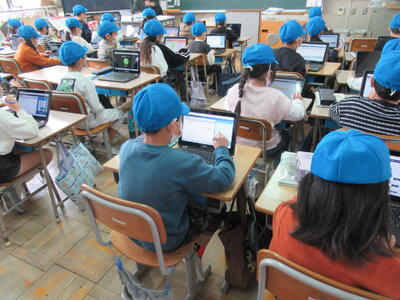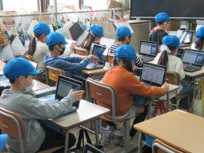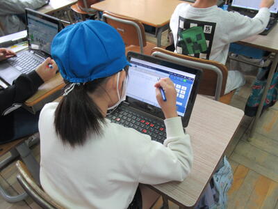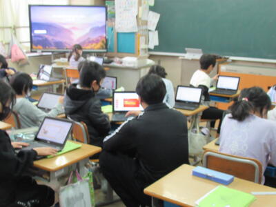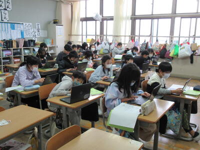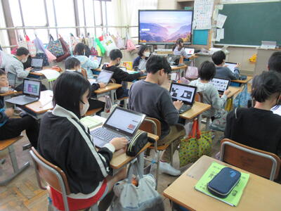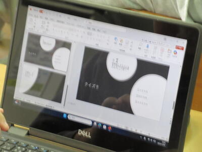 将来の夢について発表会があるとのこと。今日は、一人一人が学習者用端末でパワーポイントを使って、発表用の資料を作っていました。