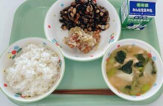 献立【ごはん 牛乳 ねぎ塩チキン 大豆の磯煮 小松菜のみそ汁】