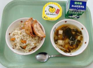 献立【焼肉チャーハン 牛乳 揚げ餃子 わかめスープ 埼玉県産桂木ゆずゼリー】
