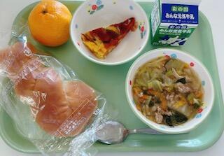献立【ツイストパン 牛乳 スペイン風オムレツ 白菜のスープ みかん🍊】