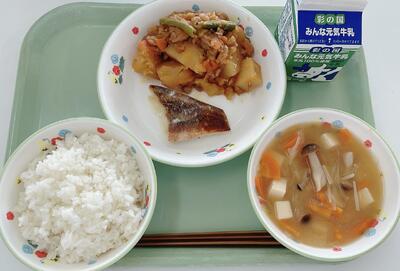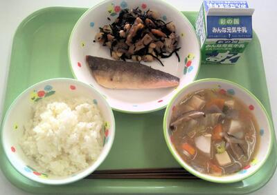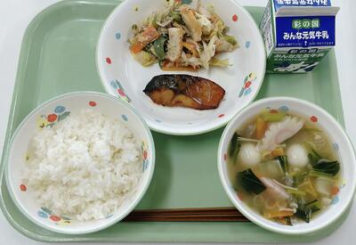献立【ごはん 牛乳 ほっけの塩焼き 大豆の磯煮 冬野菜のごまキムチ汁】