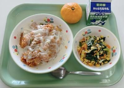 献立【チキンライスのホワイトソースかけ 牛乳 ほうれん草サラダ みかん🍊】