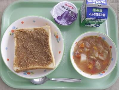 献立【ごまきなこトースト 牛乳 マンハッタンクラムチャウダー ぶどうゼリー】